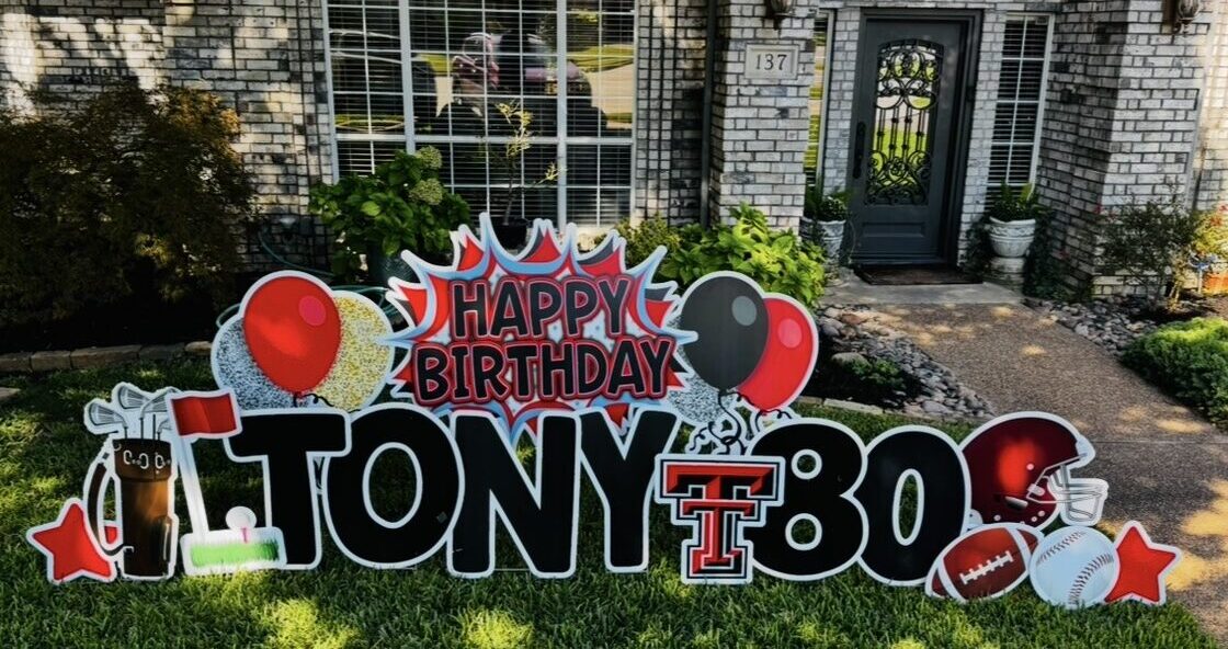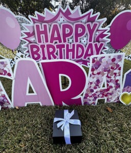 Perfect for smaller yards. This option is the 42 inch “Happy Birthday” sign (available in a variety of colors/designs) plus ONE name and Age